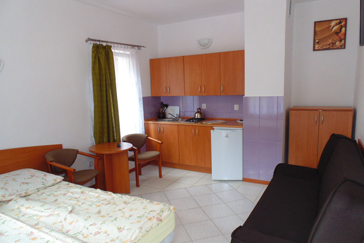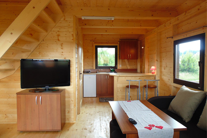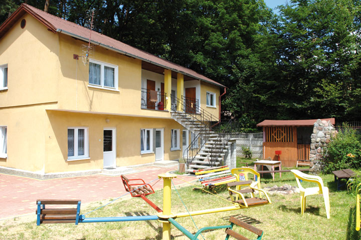 4- i 3-pokojowe z kuchnią i łazienką. Obiekt składa się z 3 budynków. W każdym pokoju jest: TV, lodówka, łazienka z natryskiem, czajnik elektryczny, podręczne naczynia. Do dyspozycji: taras (budynek nr 1), parking na posesji, miejsce do grillowania. Wędkowanie
